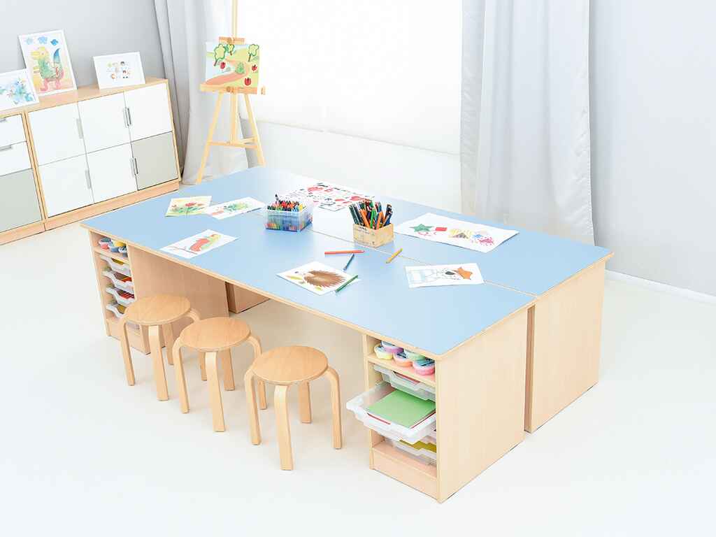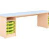 Workbench made of 2 cm thick plywood, with formica lining. Melamine frame. Includes 8 Gratnells boxes – drawers.