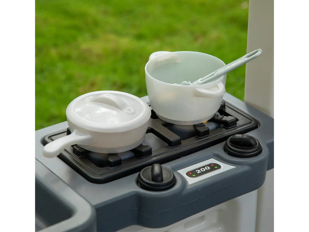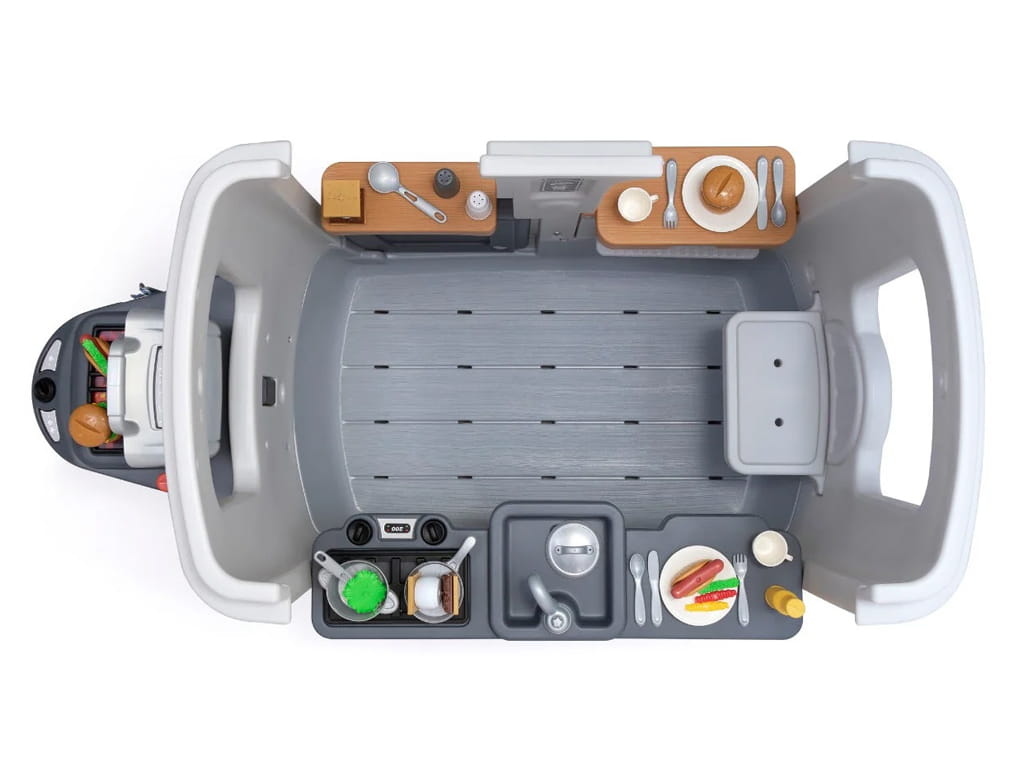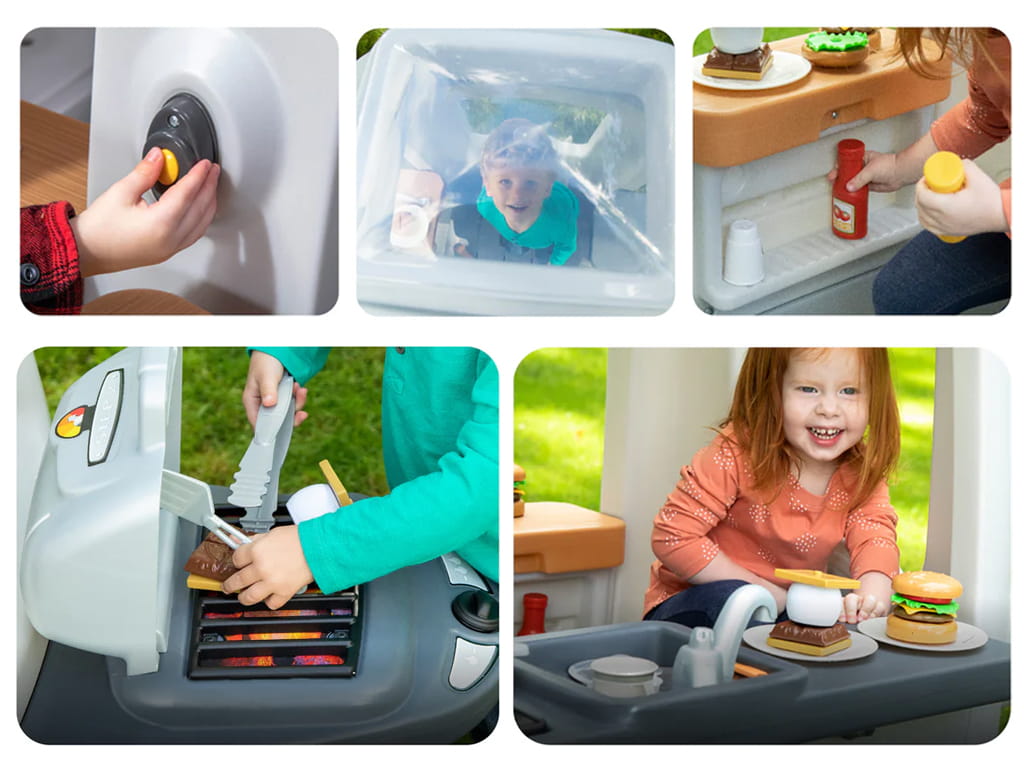 The food truck features a built-in kitchen with a large sink, a cooktop with click-and-turn knobs, and plenty of storage space, encouraging role play and social development. Children can pretend to cook, serve, and travel just like adults, building imagination and independence.