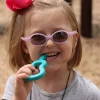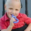 Ark’s Guitar chew. It is the right tool for the sensory integration of the oral cavity and the strengthening of the jaw. It also helps with concentration, calmness and relaxation in a safe way. The ribbed extension is just the right length to reach the back molars. Color: green. Hardness: moderate.