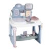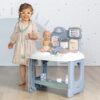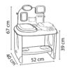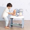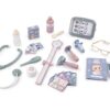 With height meter, first aid kit, place for examination and scales. Includes 28 items such as electronic tablet, stethoscope, otoscope, doll with the ability to urinate and change diapers, thermometer, patches, baby bottle and more. The tablet is interactive with voice messages and lights.