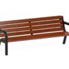 Bench with arms and back made of steel and wood. The wooden elements are finished with oil or colored glaze. Steel elements are protected from corrosion by powder coating.