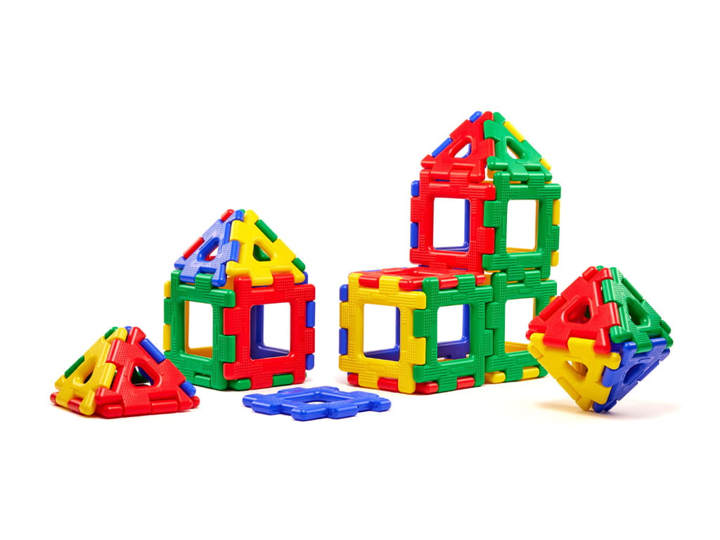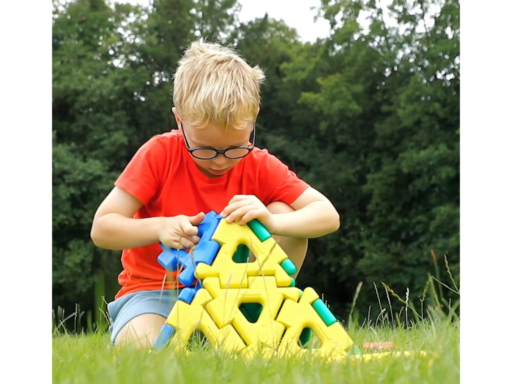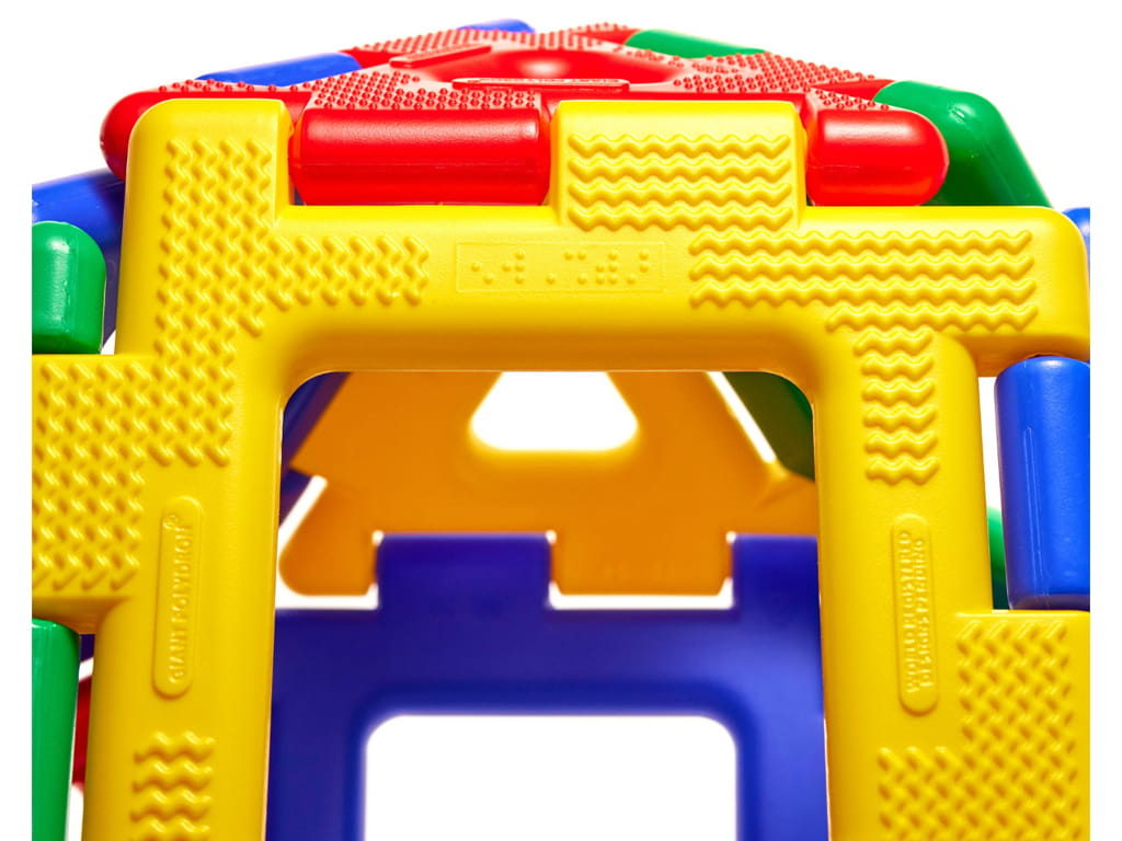 Children can easily connect the pieces and create large structures, learning basic geometry concepts such as 2D and 3D shapes. The pieces have a textured surface that makes them pleasant to touch, and they also feature Braille markings, making the toy suitable for children with visual impairments.