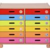 Made of synthetic wood MDF with beech lining, with wooden legs at the bottom 12 drawers with insignia. Made according to the standards: EN 71-1: 2014, EN 71-2: 2011 + A1: 2014, EN 71-3: 2013 + A1: 2014 and are accompanied by test reports .. Dimensions: 78.5 x 53.5 x 62.5 cm high