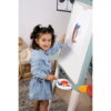 The double-sided easel board is ideal for children aged 3 and up who love drawing and creativity. It features two surfaces: a blackboard for chalk and a white magnetic board for markers, offering multiple options for drawing, writing, and play. The large surface allows children to express their imagination, learn the alphabet, or create their own works of art.