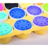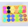 A plastic egg carton containing eggs that each pop open to reveal brightly colored centers with matching numbers. Ideal for learning counting, number recognition and color matching.