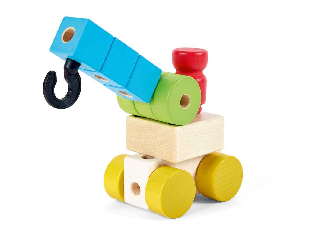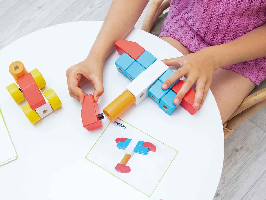 The set includes 102 pieces with a connection system that allows easy assembly even by small hands, while at the same time enhancing fine motor skills and three-dimensional perception. The 8 cards with construction templates offer inspiration and ideas for various creations, while encouraging critical thinking and imagination through guided or free play.