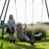 The double swing is the ideal choice for garden fun for two children at the same time. It features two swings with adjustable seat heights, allowing them to grow with the children, and climbing bars on each side for swinging, hanging, and flipping play.