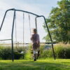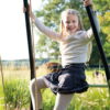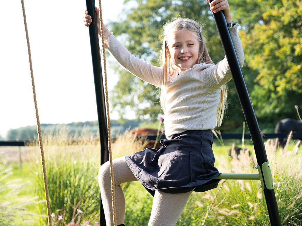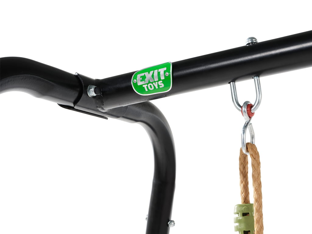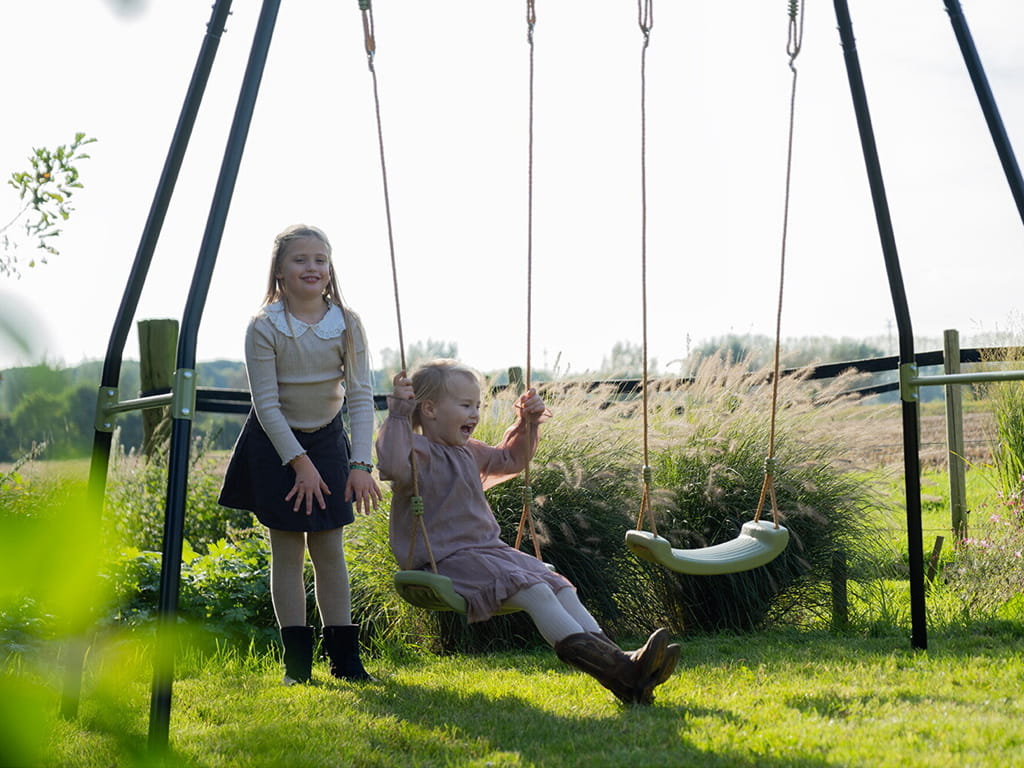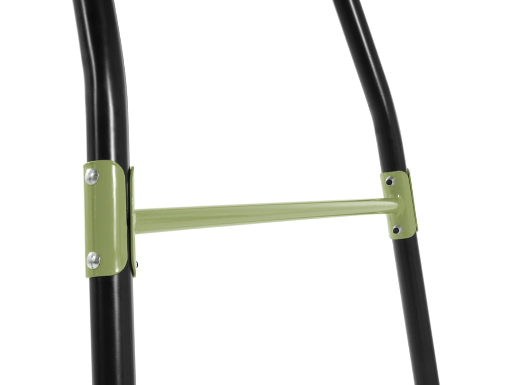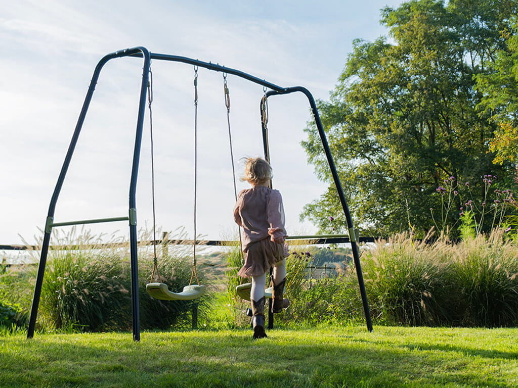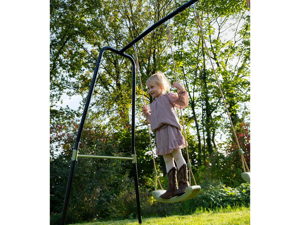 The swing has a black metal frame and seats in a subtle green color, giving a modern look to your garden. The frame, made of galvanized and powder-coated metal, ensures weather resistance and protection against rust. The unique angle of the frame’s sides increases stability, while concrete anchoring keeps the swing firmly in place and safe during play.