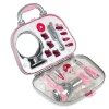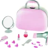 - Includes brush, comb, clips, hair, fragrance stick, and a mirror