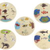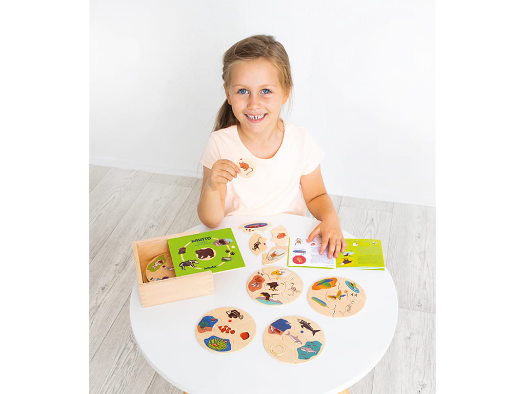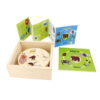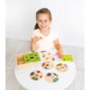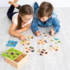 The set includes 45 puzzle pieces and features a design that allows self-checking through shapes, helping children recognize on their own whether they have placed the pieces correctly. It comes with a wooden storage box, ideal for organization and easy transport.
