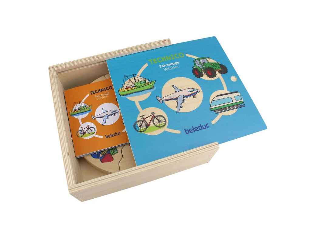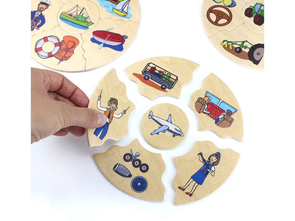 The “Vehicles” logic puzzle offers children a fun and educational introduction to the world of technology and transportation. Through the discovery of five different vehicles (road, agricultural, rail, air and sea), children are invited to match people, objects and activities with the appropriate means of transport.