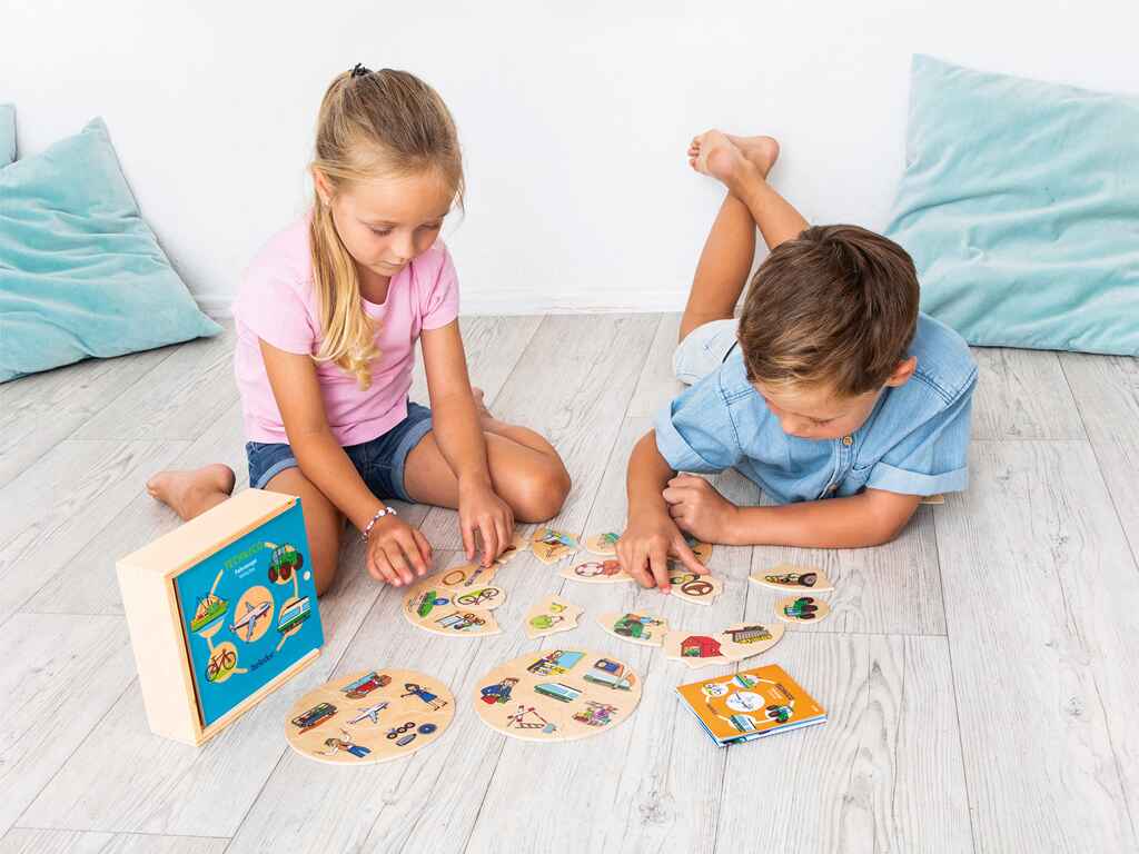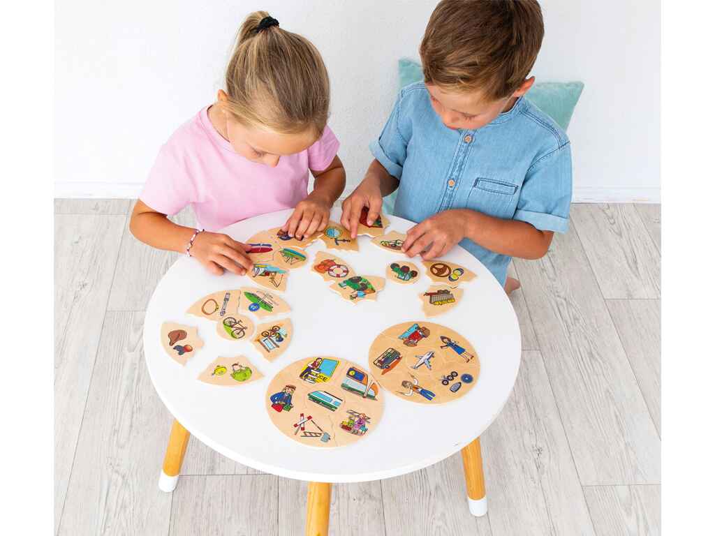 Each vehicle is accompanied by five relevant details, which the child must identify and connect correctly, thus strengthening their logical thinking and ability to classify. The puzzle promotes learning through play, offering the possibility of self-control so that children can verify their choices themselves.