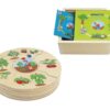 The puzzle includes 6 different growing areas (above ground, below ground, on a tree, on a bush, in a field, in water) and 30 wooden pieces. The special design with self-checking outlines helps children correct their mistakes on their own and learn through practice, strengthening their autonomy.