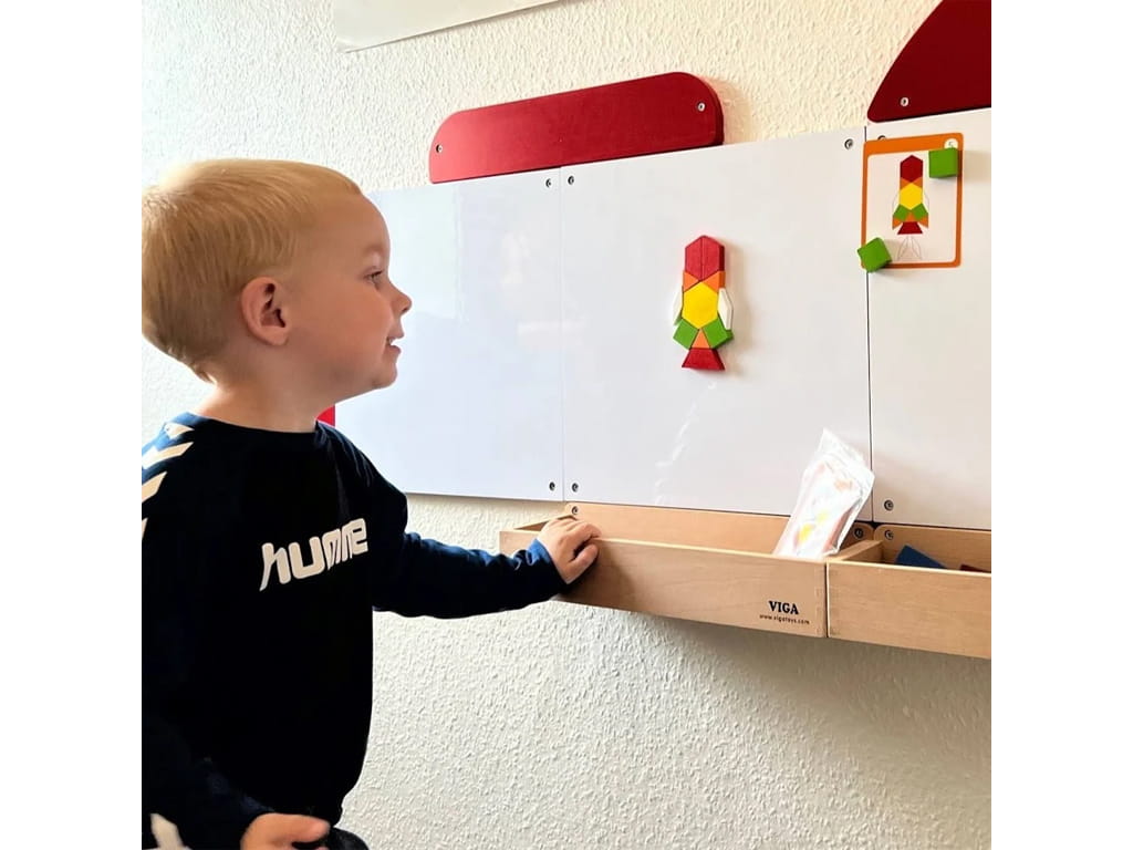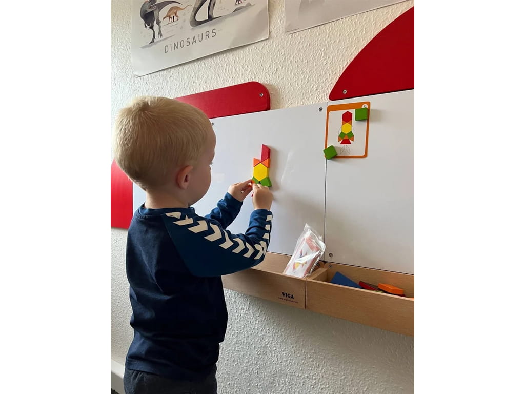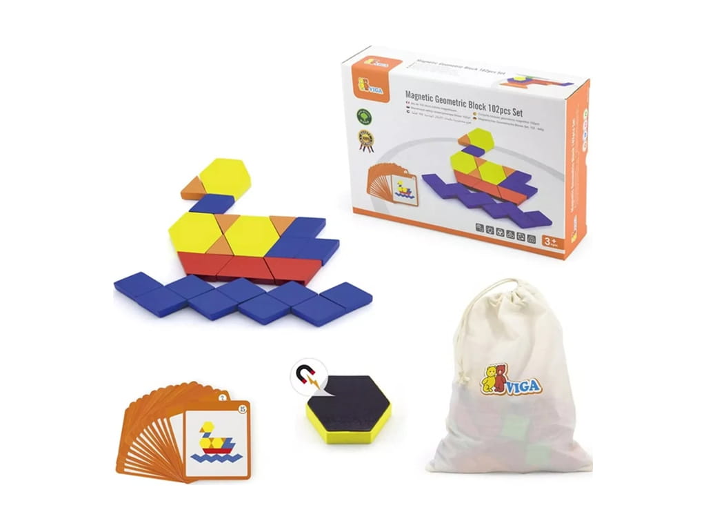 The magnetic geometric blocks are a creative and educational toy that helps children discover basic concepts of geometry through play. The set includes 102 wooden magnetic pieces in bright colors and different geometric shapes, such as triangle, square, rhombus, hexagon, and trapezoid.