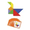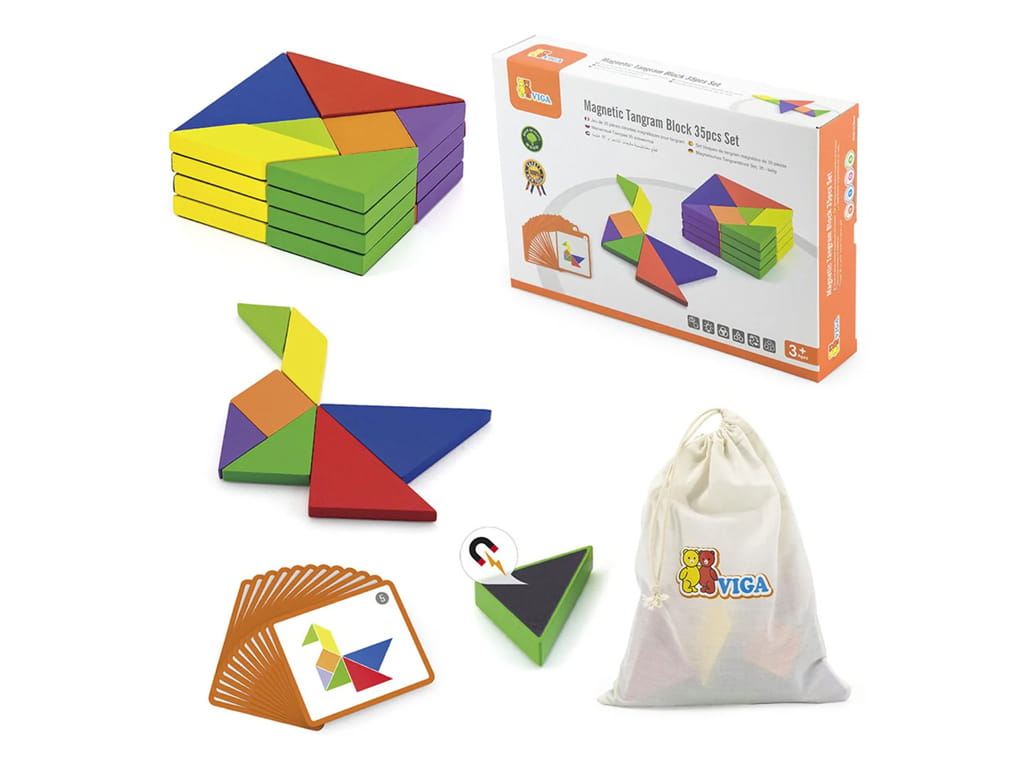 The magnetic tangram block is a creative and educational toy that helps children develop their thinking and imagination through play. The set includes 35 wooden magnetic pieces in bright colors and 20 double-sided cards with a total of 40 different designs that children can create.
