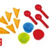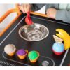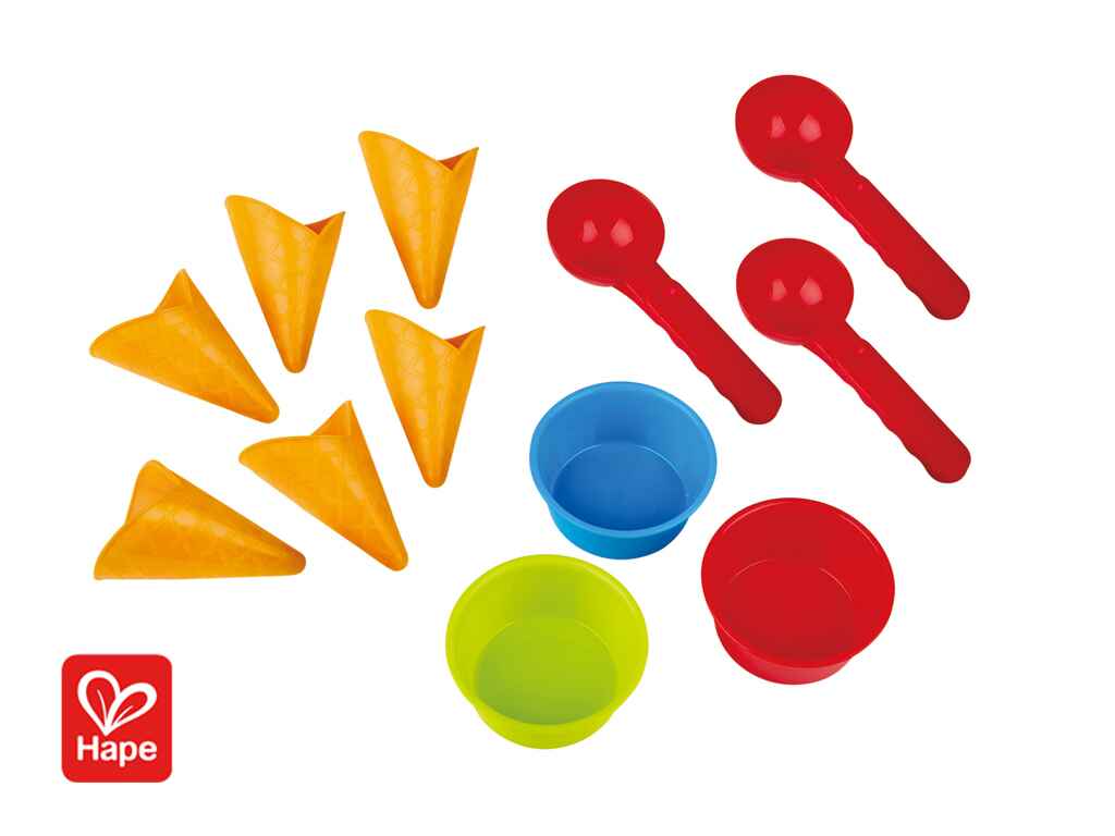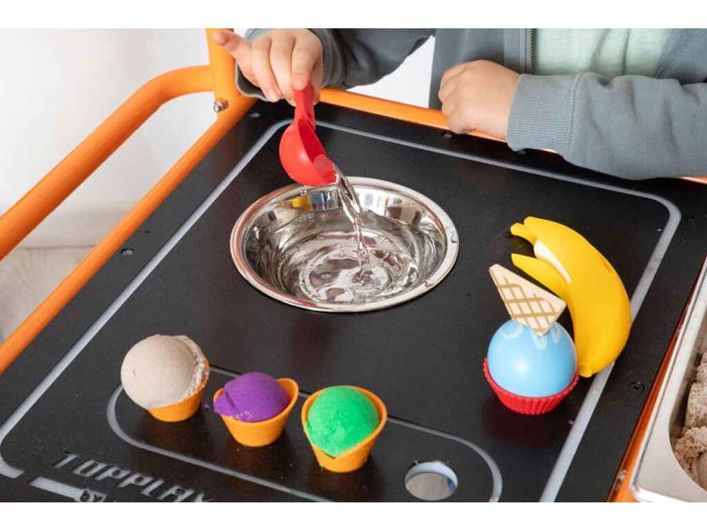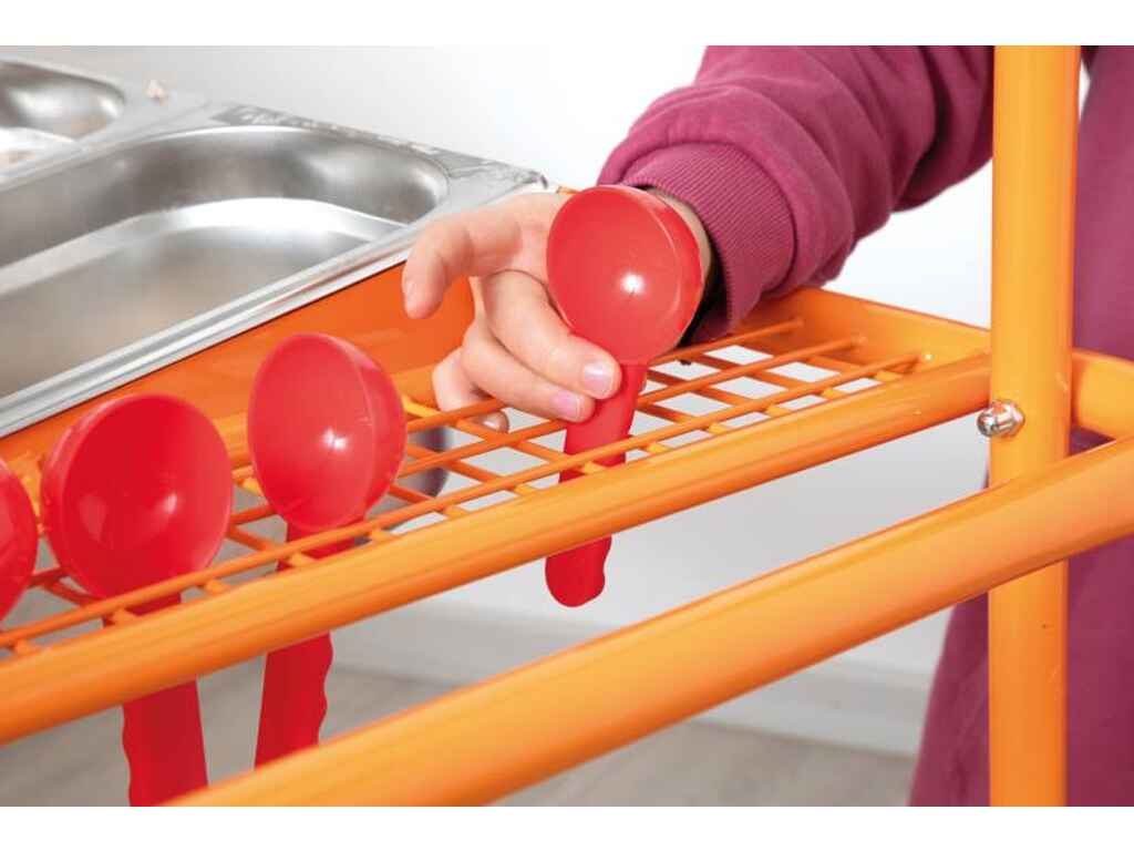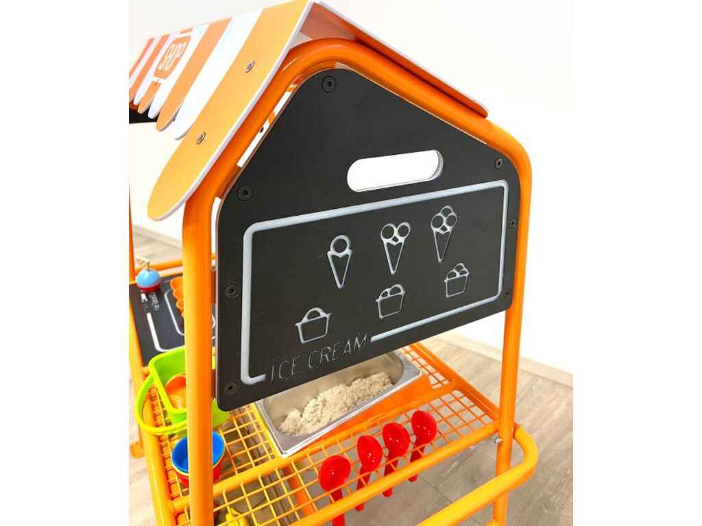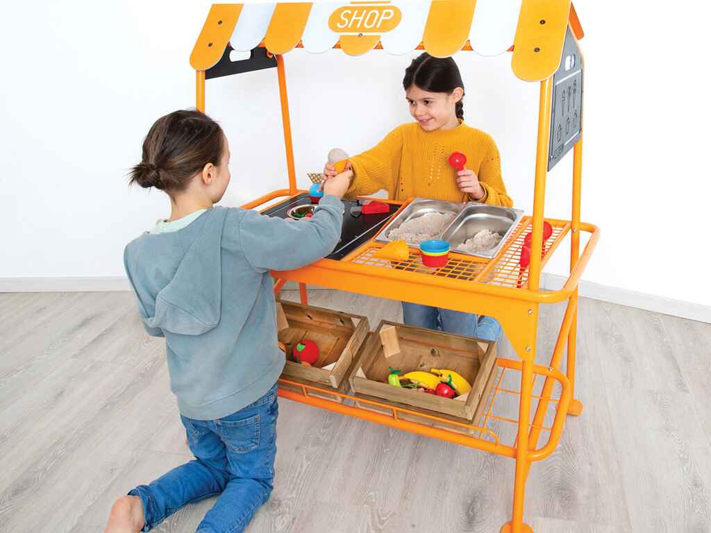 The realistic design with a built-in ice cream menu, stainless steel bowls, cones and cups, offers endless possibilities for role play, such as the ice cream shop or the grocery store. Children take on roles, create scenarios and communicate with each other, developing social and language skills.