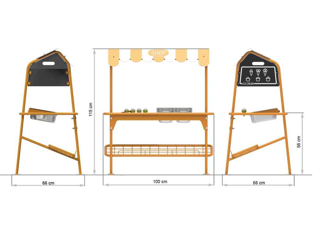 The Metal Ice Cream Shop with Roof is a great idea for creative role play that excites young and old alike. Made of durable metal and HDPE, it is ideal for both indoor and outdoor spaces, such as yards or playgrounds.