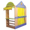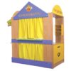 Made of synthetic MDF board with beech coating, polished to the natural color of wood with some elements colored. It has three sides and each side is a separate corner: puppet theater with two screens, grocery store and post office. On each side (corner) of the inscription (engraved in precision electronic machine). The two side are oval and the front is triangular. Above the inscription “PUPPET” is engraved clown, painted in vivid colors. The entrance is at the back of the polygon. The grocery store carries tent and puppet theater curtains. Paints and varnishes used are water. Dimensions: 130 x 75 cm .. height: 165 cm