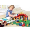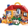 The set includes a house that opens with a folding garden, furniture and appliances, family and pets along with an educational CD that supports early learning until