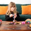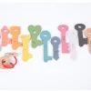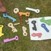 Beech wood keys, all with different lugs, numbered 0 to 10 on one side with corresponding dots on the reverse. Ideal for number recognition, learning to count and practicing fine motor skills. Includes key lanyard and cotton storage bag.