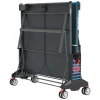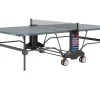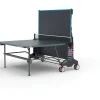 Outdoor ping pong table 6. Intended for indoor and outdoor use. Built-in net, does not need to be removed when folding. Locking mechanism. Possibility of individual training. Corners with protective pads and racks for rackets and balls. Double wheels 4 pcs. 140 mm with brake. 57 mm elliptical steel legs. 6mm resin playing surface which makes it resistant to scratches and color fading, as well as an anti-glare finish. Adjustable legs, safety lock.