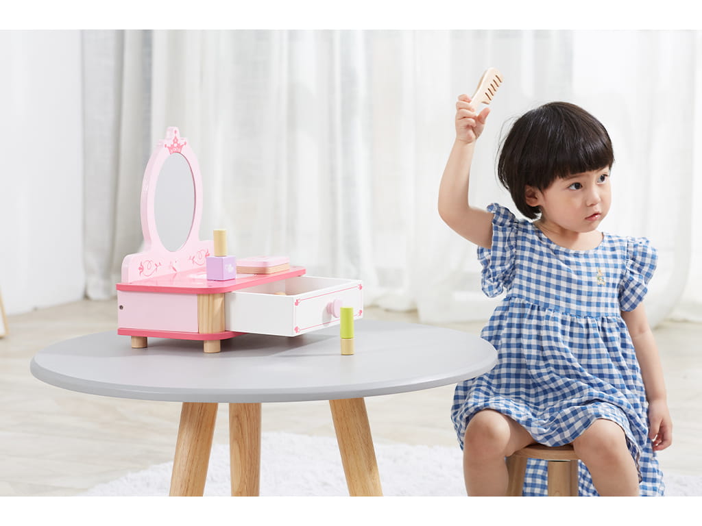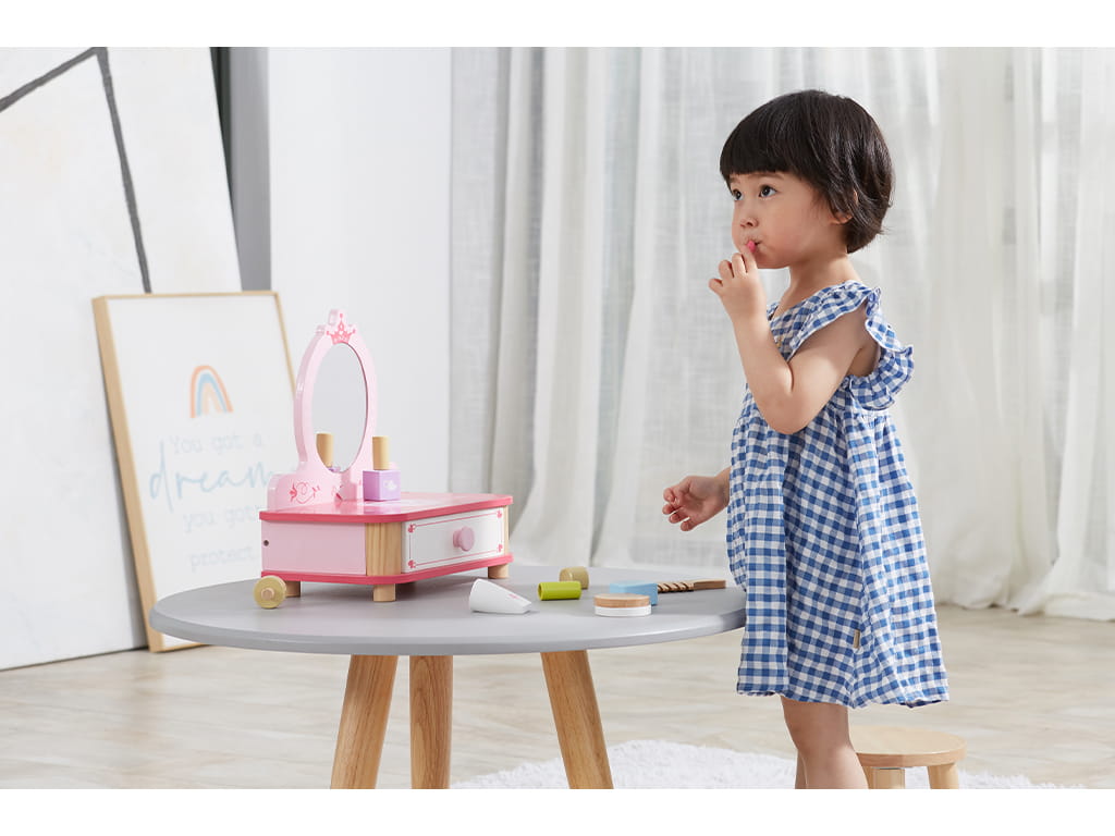 The set includes a wooden table with a built-in mirror and drawer, as well as grooming accessories such as a comb and makeup items (nail polish, lipstick, perfume, cream, and eyeshadows). The practical drawer helps store items, keeping the space neat and organized.