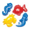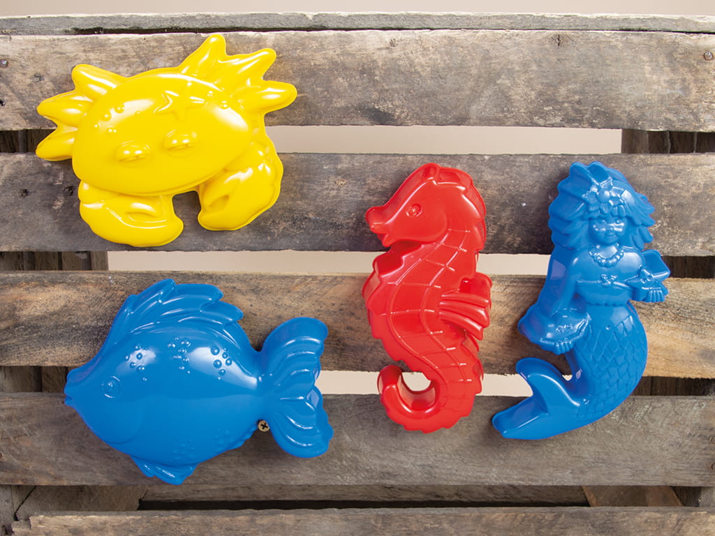 Sand molds sea animals encourage children to explore a magical underwater world. The set includes four designs: a seahorse, a fish, a crab, and a mermaid, made from durable plastic in bright colors such as blue, red, and yellow.