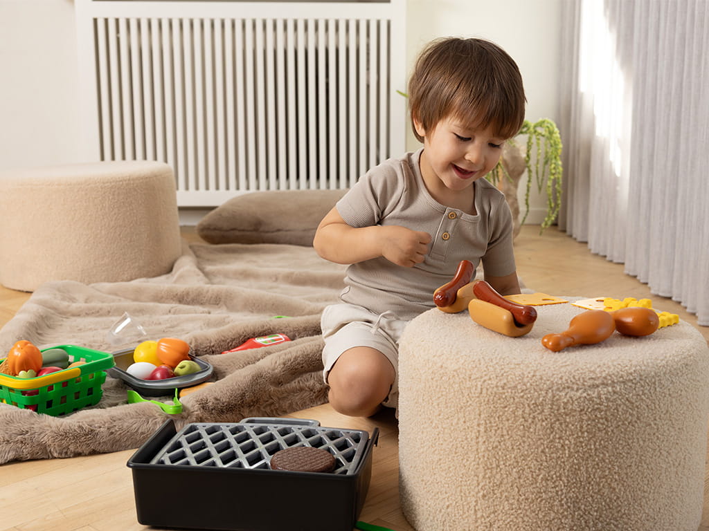 Children can choose between vegetables, sweets, ice creams, burgers, sandwiches, steak, or fresh salad, preparing different meals each time. This makes play more creative while also helping children learn to recognize different foods and types of meals.