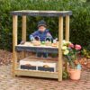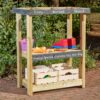 Wooden shop with a bench and a shelf that you can transform into anything you want with the right accessories. Made of solid wood and painted with chalkboard paint on the top and front of the shelf.