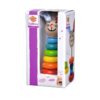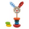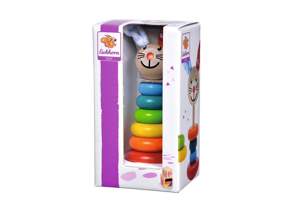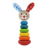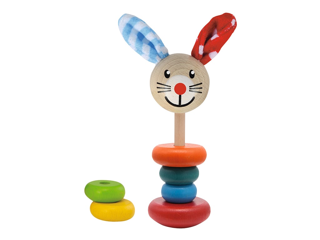 Bunny stacking toy, consisting of 6 colorful wooden rings in different colors and sizes. The children have to place the rings on the base according to the size. Promotes motor skills, concentration and hand-eye coordination in children from one year of age. Made from 100% FSC beech wood from sustainable forests and painted with safe non-toxic water-based paints.