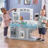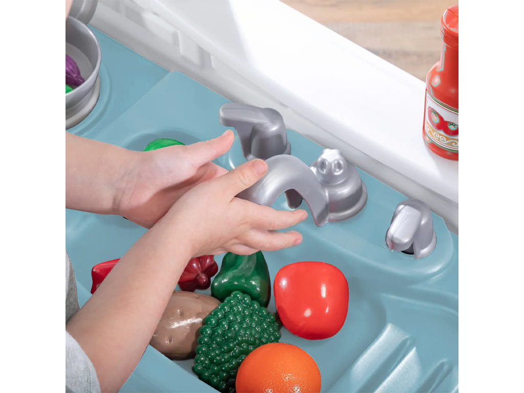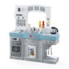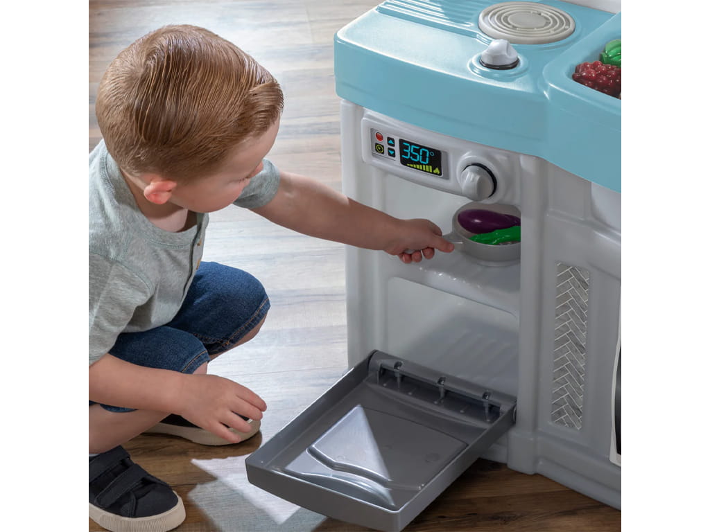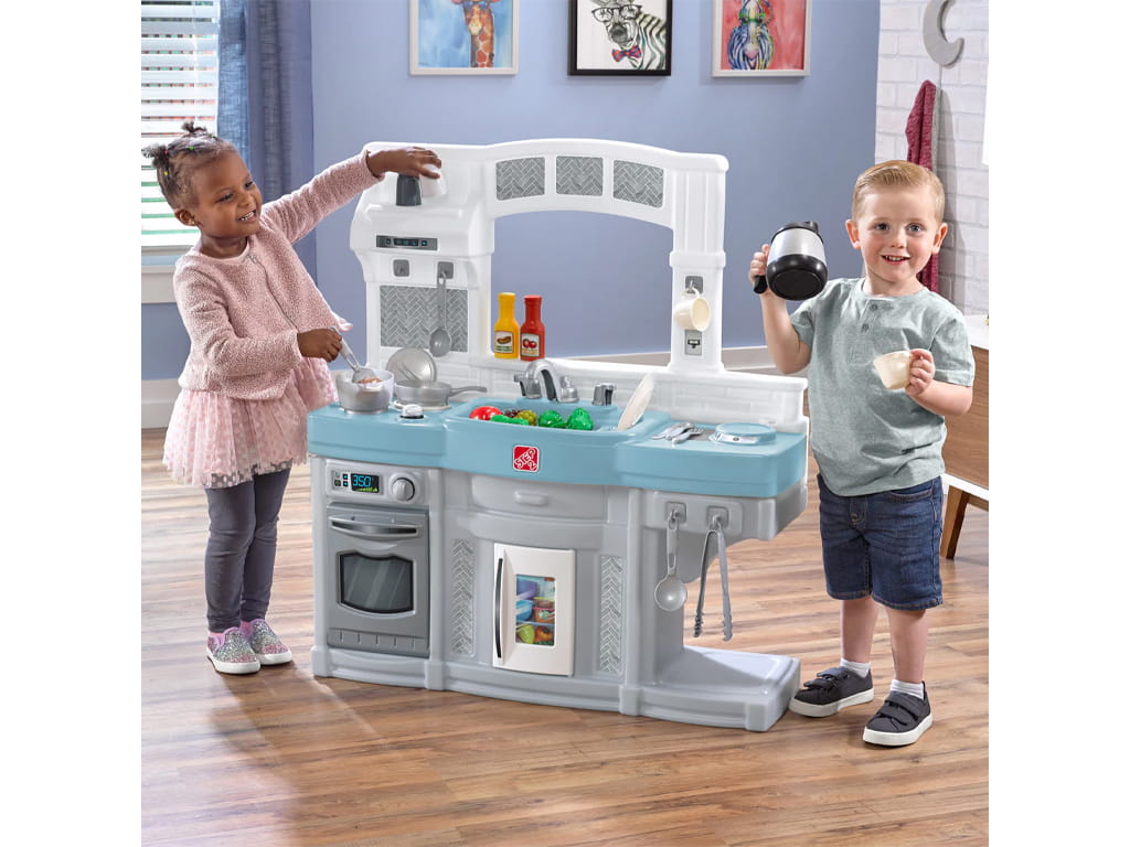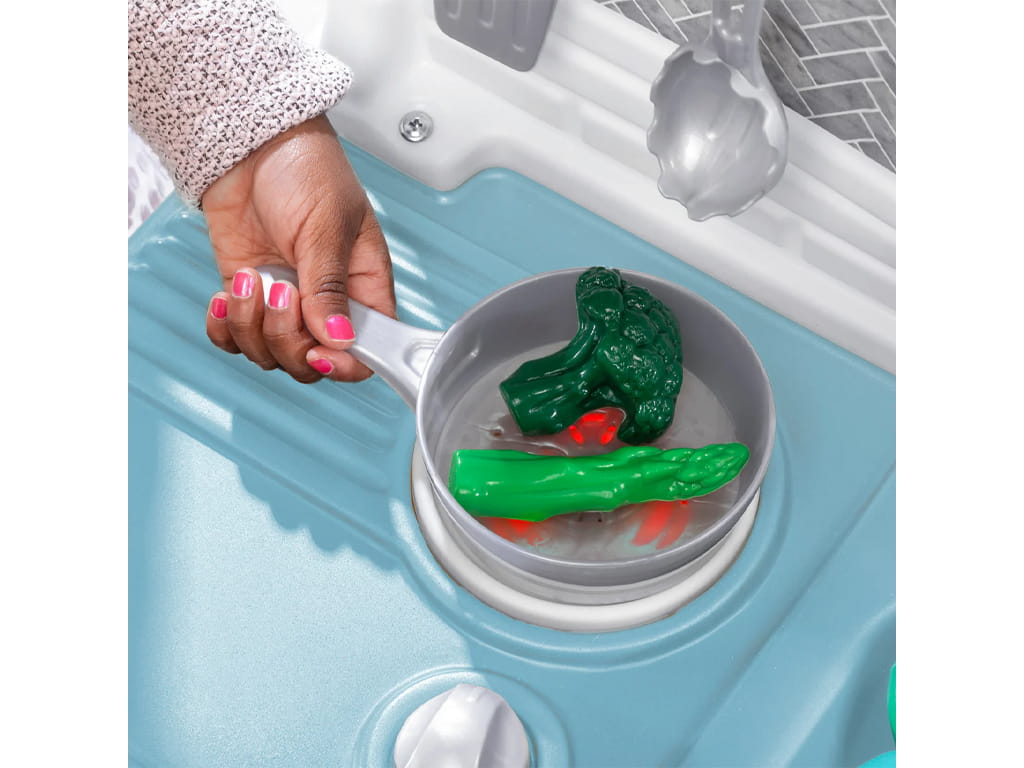 The electronic burners light up and produce boiling and sizzling sounds, making play even more lively and fun. The neutral color scheme with faux stone details adds style and fits any playroom. The kitchen is built for durability and easy cleaning, allowing children to enjoy endless hours of play.