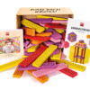 The set includes 60 blocks in 6 vibrant colors (yellow, orange, red, pink, purple) and a 24-page educational booklet with step-by-step instructions, play ideas, and an introduction to basic building techniques. Activities cover measurement, arithmetic, geometry, architecture, language, and artistic skills, making the set ideal for schools, kindergartens, and creative activities at home.