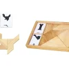 The wooden Tangram in a box is an educational and creative toy suitable for children aged 3 years and up. It consists of 7 wooden pieces and cards with designs of varying difficulty, and is stored in a practical wooden box. Children can arrange the pieces according to the cards or create their own designs, enhancing their imagination and creativity.