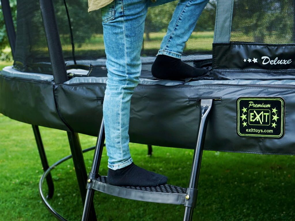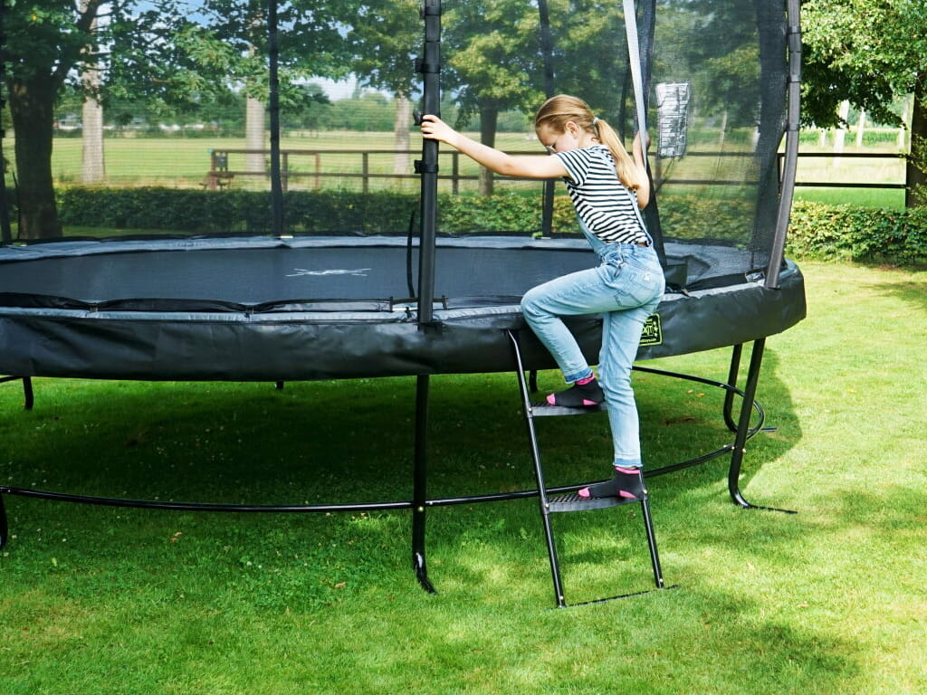 The trampoline ladder with adjustable height 65–80 cm is the ideal accessory for children and adults to safely climb onto trampolines. Suitable for trampolines with a frame height between 65 and 80 cm and a diameter of 253 or 305 cm, this ladder provides easy access without the risk of slipping.