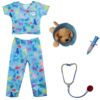 - The set includes blue pants with a matching blouse, face mask, name tag, toy stethoscope, toy syringe, collar & your first patient.