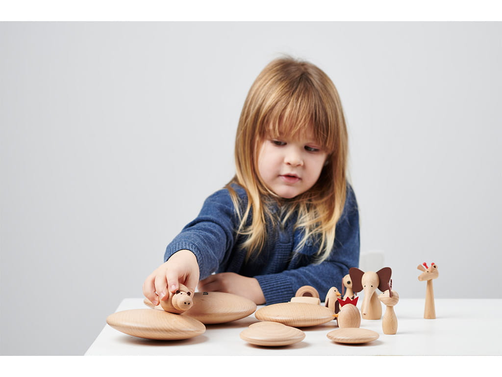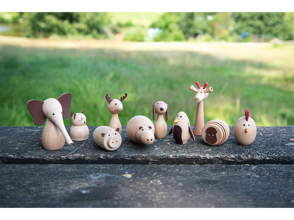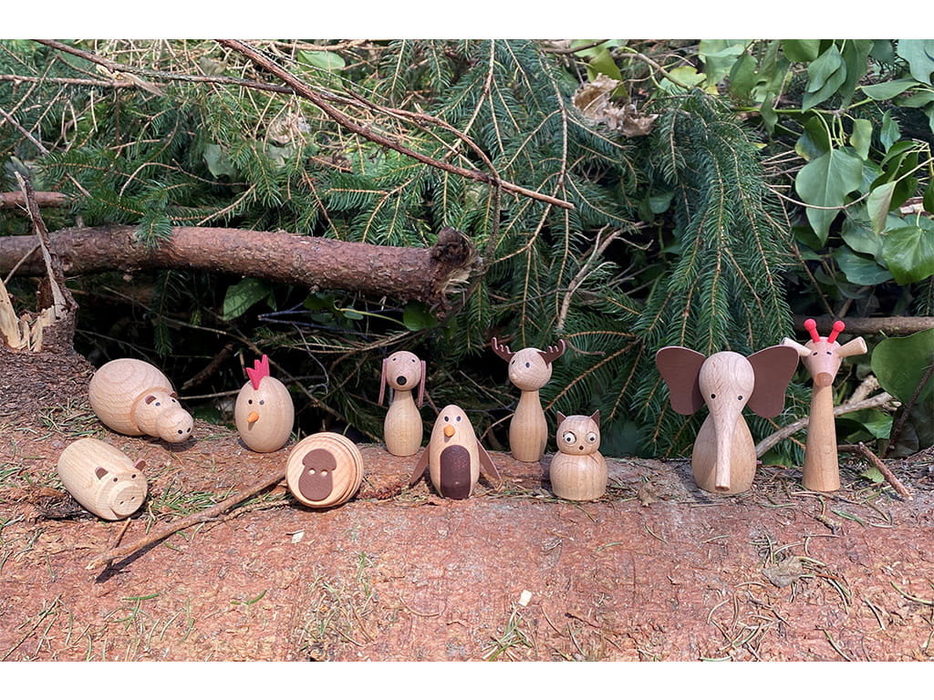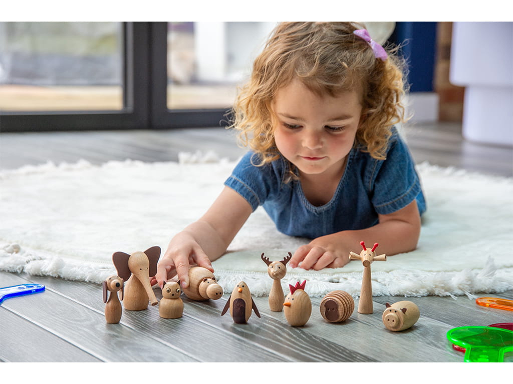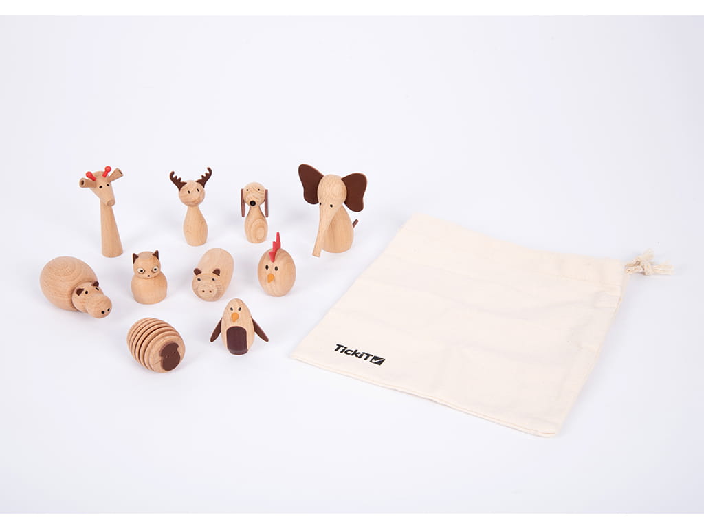 The Wooden Animal Friends Stage set introduces children to the magical world of animals from around the globe. The set includes 10 wooden animals made from beautiful, natural beech wood, with a smooth finish, simple printed features, and decorative faux leather details.