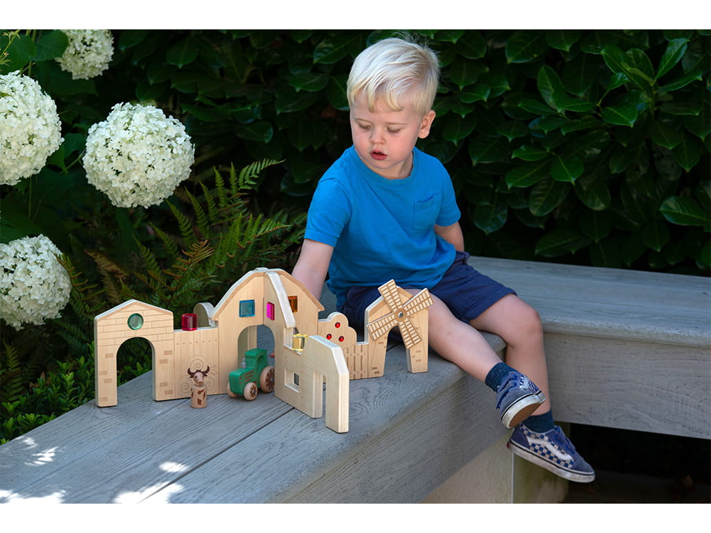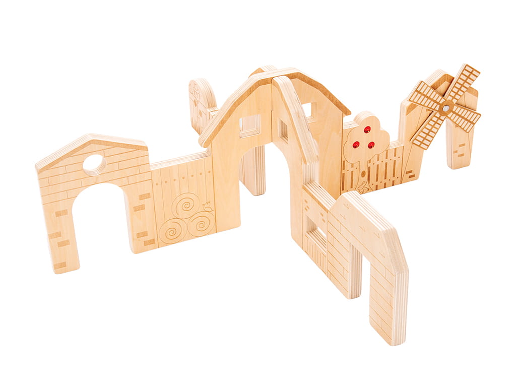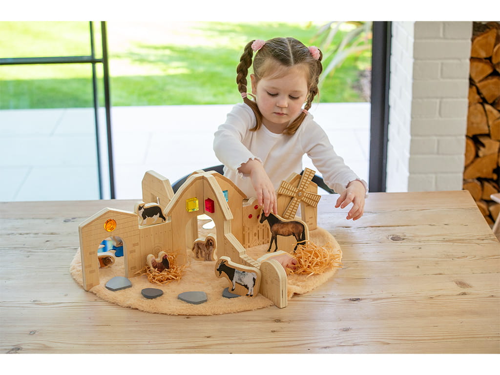 Each panel features engraved farm-themed details that provide a rich sensory experience, while elements such as the tree with “gems” and the moving windmill add interactivity and excitement to play. Children can create their own stories by placing animals, figures, and objects, developing their creativity and storytelling skills.