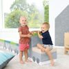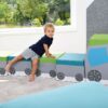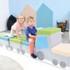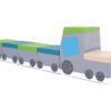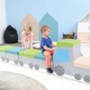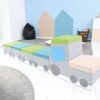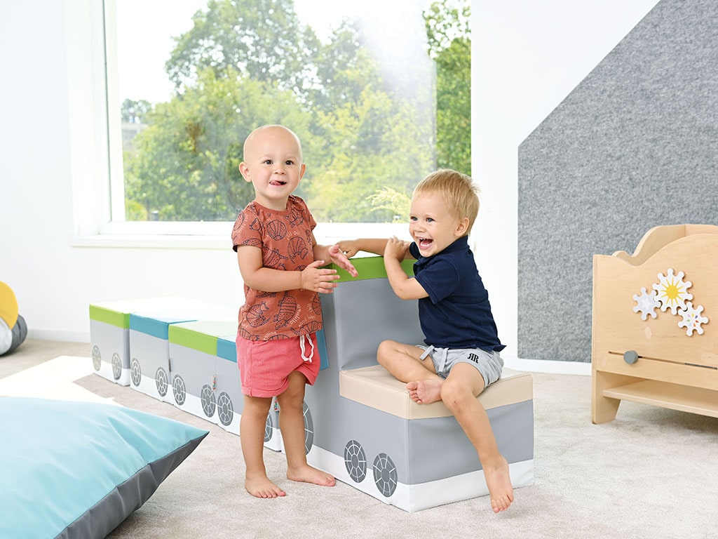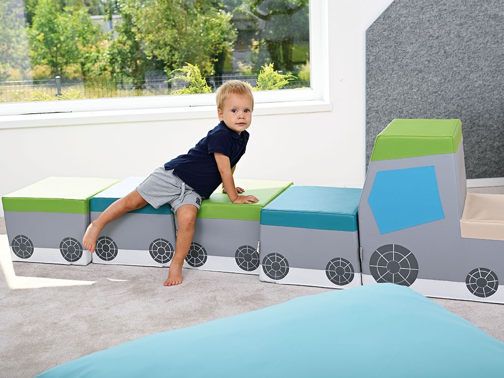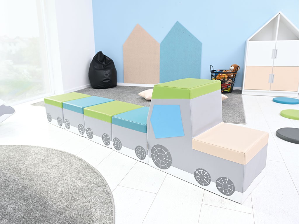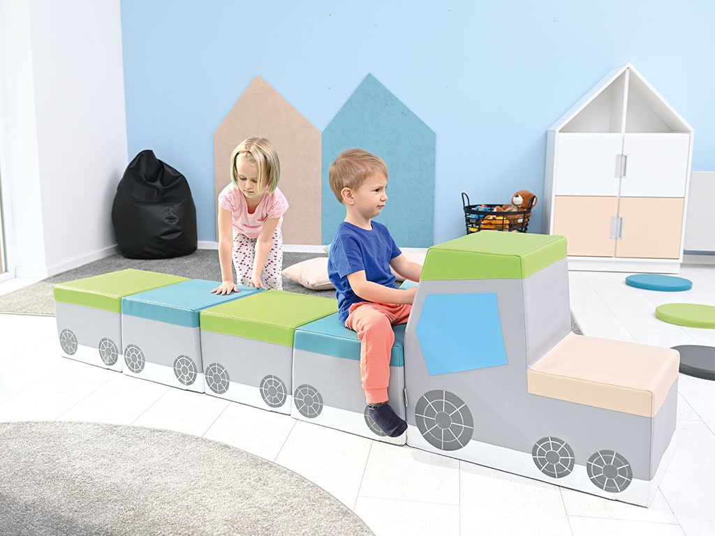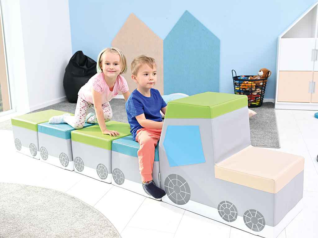 Αφρώδες σετ, επενδυμένο με ανθεκτικό ύφασμα PVC, απαλλαγμένο από φθαλικές ενώσεις, που διατηρείτε εύκολα καθαρό. Αποτελείται από 4 βαγόνια πουφ και 1 πουφ ατμομηχανή. Συνολικό μήκος: 215 εκ.