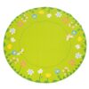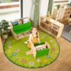 Χαλί στρόγγυλο, σε πράσινο χρώμα με λουλουδάκια, πεταλούδες και μελισσούλες. Το χαλί αποτελείται από 100% ασφαλές και υποαλλεργικό πολυαμίδιο και το πίσω μέρος του είναι επενδυμένο με αντιολισθητικό υλικό ώστε τα παιδιά να παίζουν και να εκτελούν τις δραστηριότητες τους με απόλυτη ασφάλεια.