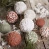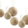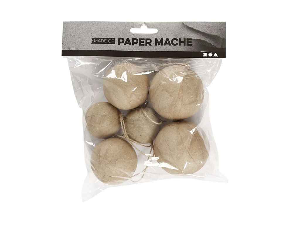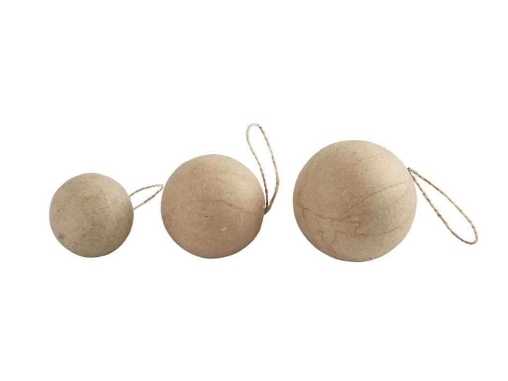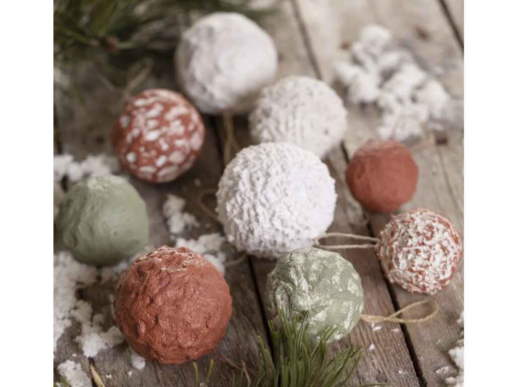 Χριστουγεννιάτικα στολίδια από papier-mâché με εσωτερικό πυρήνα από πλαστικό για σταθερότητα με κορδόνι. Τεμάχια: 6. Διάμετρος: 2 x 4 εκ. – 2 x 5 εκ. 2 x 6 εκ.