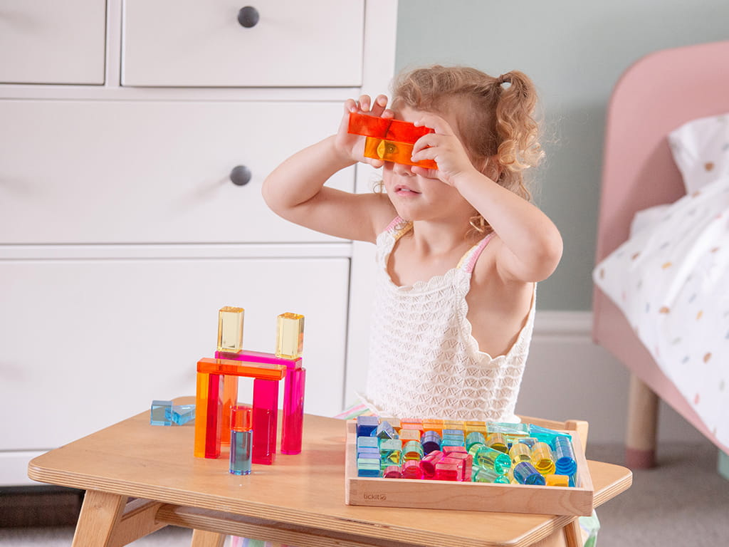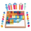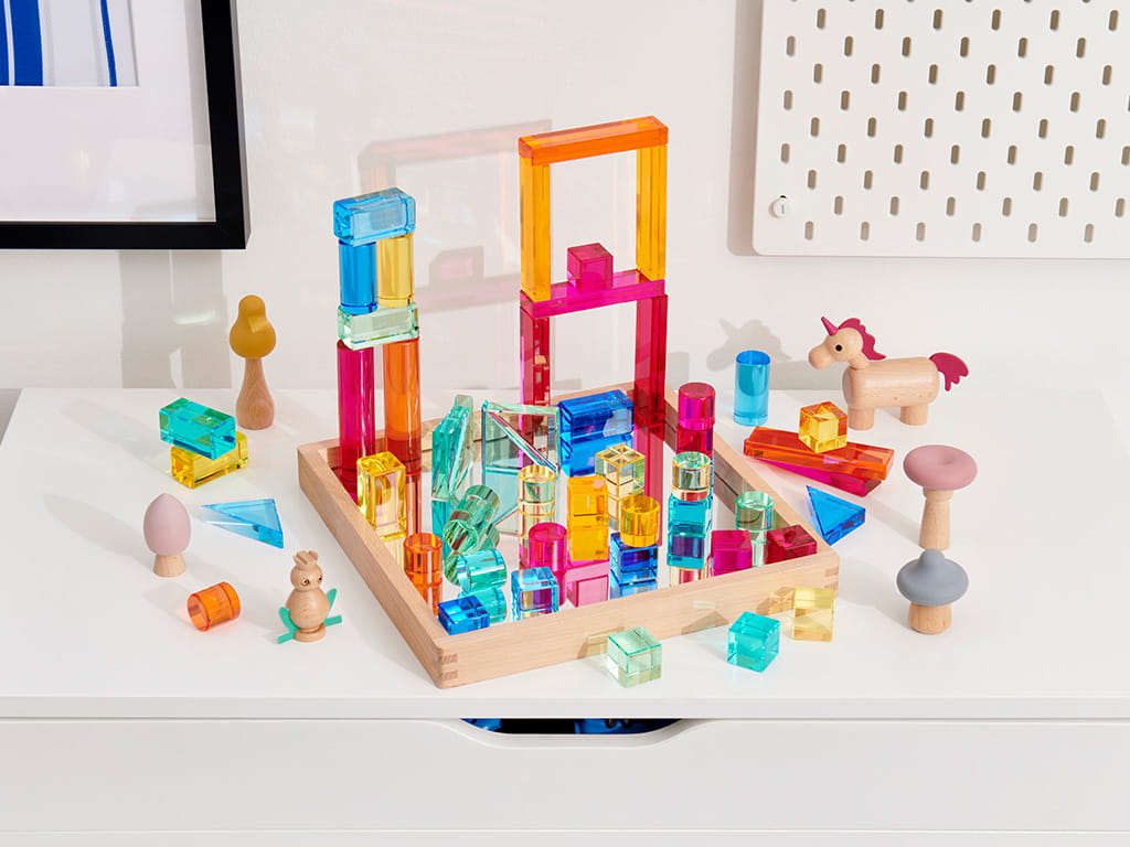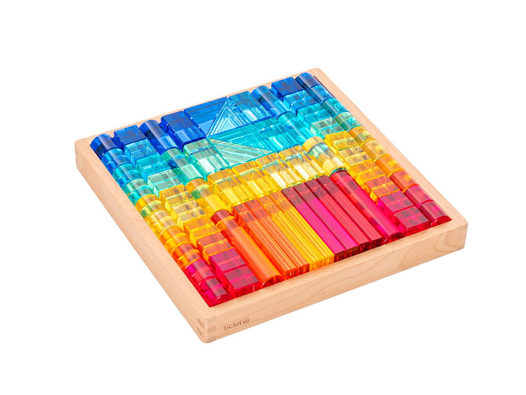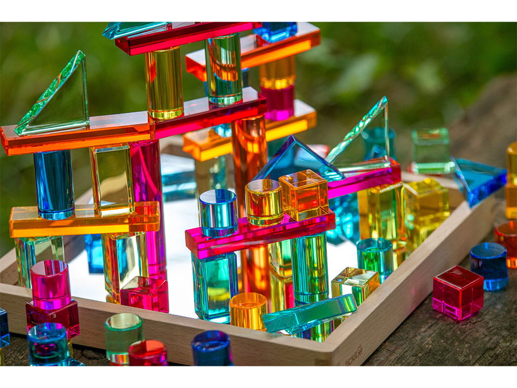 Ο δίσκος με καθρέφτη και πολύχρωμα σχήματα sensory συνδυάζει ξύλο και ακρυλικό για μια μοναδική εμπειρία δημιουργικού παιχνιδιού. Περιλαμβάνει λεία ακρυλικά τουβλάκια σε επτά διαφορετικά σχήματα, κύβους, κύκλους, κύλινδρους, ορθογώνια, παραλληλόγραμα και τρίγωνα που προσφέρουν ατελείωτες δυνατότητες κατασκευών και εξερεύνησης.