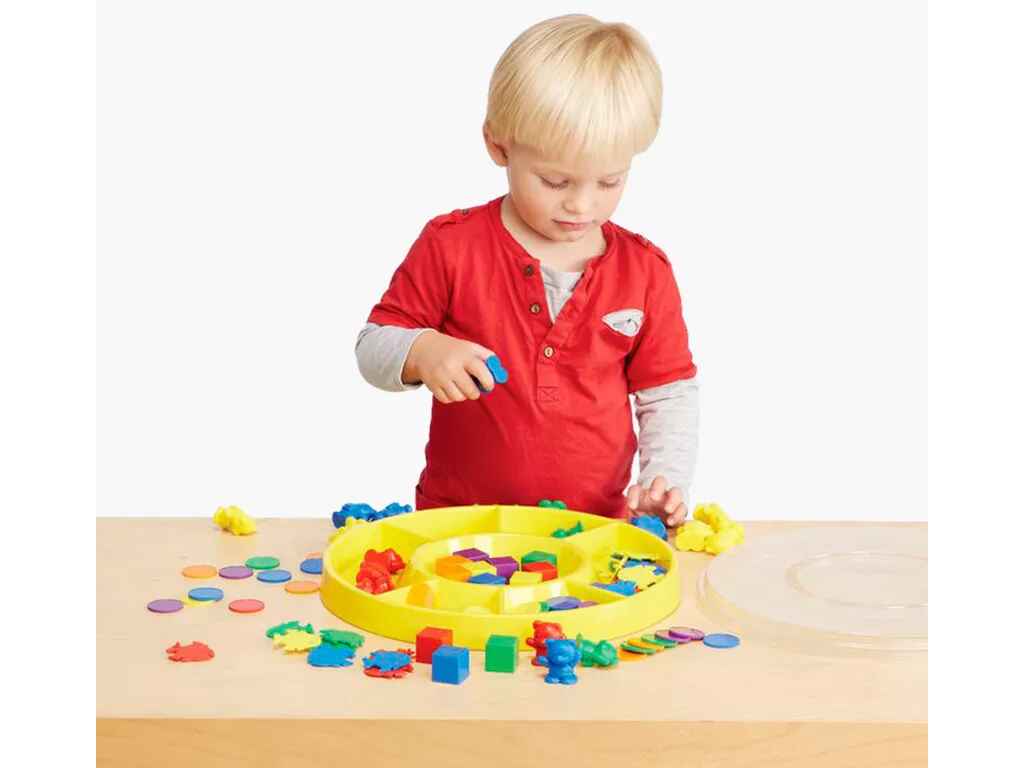 Δισκάκι ταξινόμησης τα παιδιά προσχολικής ηλικίας είναι φυσικά περίεργα για την ταξινόμηση αντικειμένων. Το ενδιαφέρον τους τους βοηθά να αναπτύξουν βασικές δεξιότητες όπως το μέτρημα, η σύγκριση, η ταξινόμηση και η διαμόρφωση μοτίβων, όλες σημαντικές δεξιότητες για πιο προχωρημένες μαθηματικές έννοιες. Περιέχει 132 αντικείμενα με 6 χρώματα και 4 σχήματα. Ηλικία: 18 μηνών και άνω.