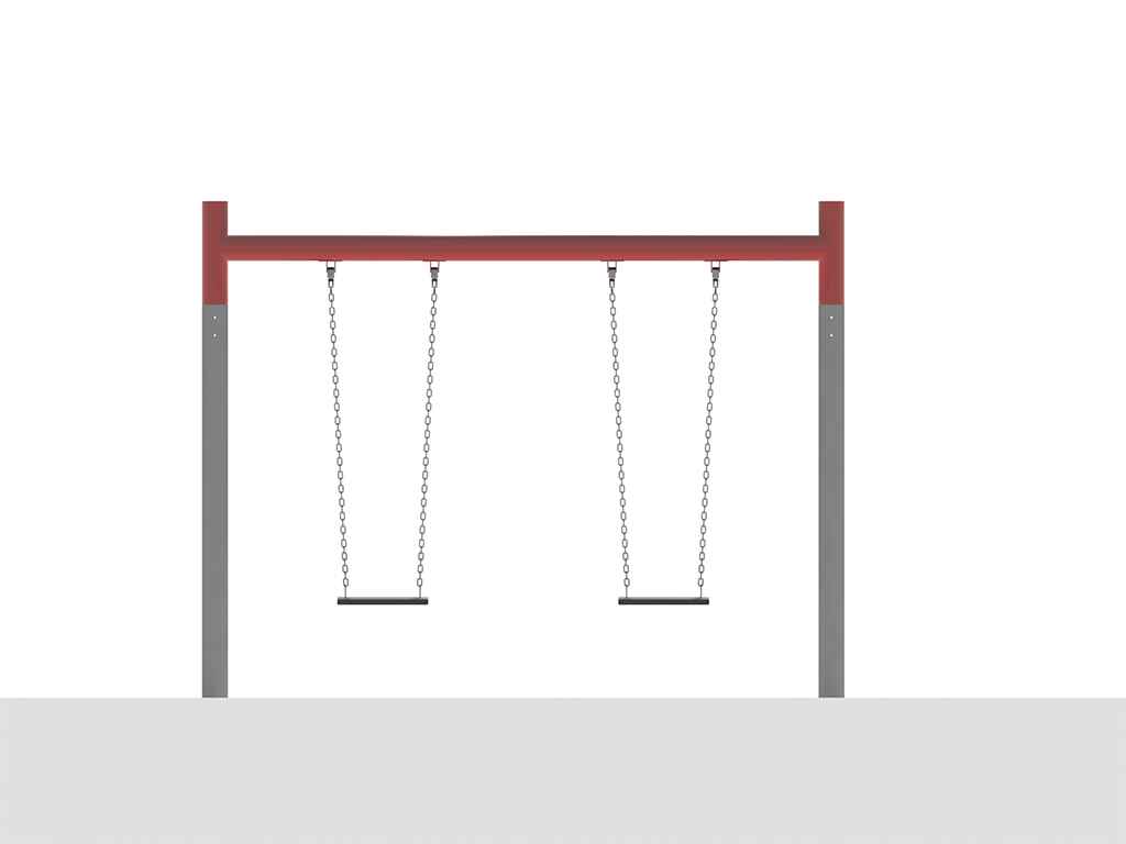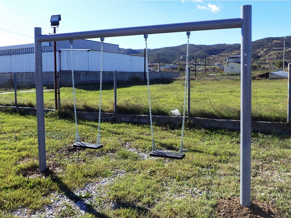Διθέσια κούνια παιδικής χαράς παίδων τύπου Π. Η οριζόντια δοκός της κούνιας κατασκευάζεται από ενισχυμένο σιδηροσωλήνα Φ114 χιλ. Στηρίζεται σε δύο μεταλλικά υποστυλώματα από σιδηροσωλήνα Φ114 χιλ. Στο κάτω μέρος της δοκού και σε κατάλληλες θέσεις συγκολλούνται τέσσερα κουζινέτα ειδικά σχεδιασμένα για την ανάρτηση των καθισμάτων. Τα καθίσματα έχουν διαστάσεις 44 x 18 x 4 εκ. και είναι κατασκευασμένα από καουτσούκ με εσωτερική ενίσχυση από αλουμίνιο. Αναρτώνται από τα κουζινέτα με τη χρήση ζεύγους γαλβανισμένων αλυσίδων.