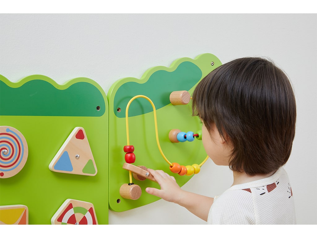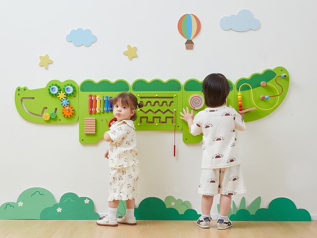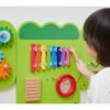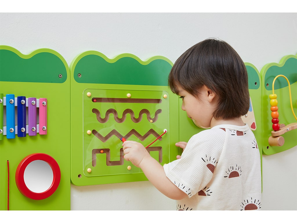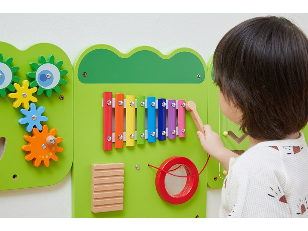 Το επιτοίχιο παιχνίδι δραστηριοτήτων ενισχύει τη λεπτή κινητικότητα και τον συντονισμό ματιού-χεριού, καθώς τα παιδιά μετακινούν αντικείμενα, περιστρέφουν γρανάζια και χρησιμοποιούν το μαγνητικό παιχνίδι προγραφής. Οι μουσικές δραστηριότητες, όπως το μεταλλόφωνο και η ξύστρα, εισάγουν τα παιδιά στον κόσμο των ήχων και της ρυθμικής εξερεύνησης, ενισχύοντας τη μουσική αντίληψη.