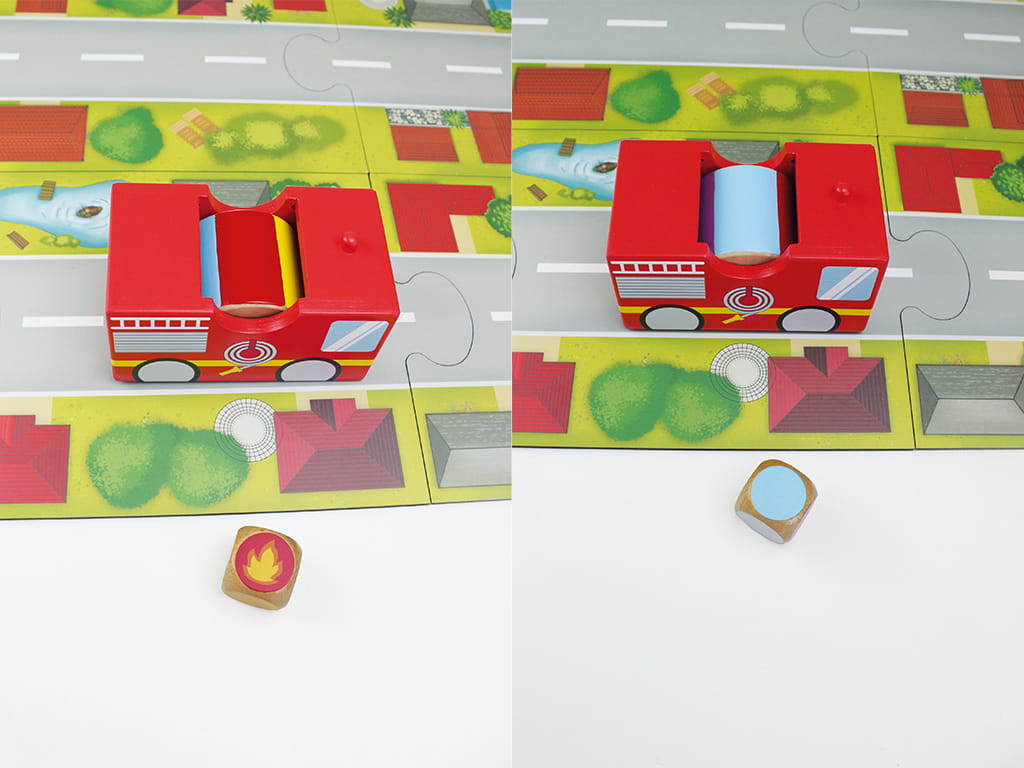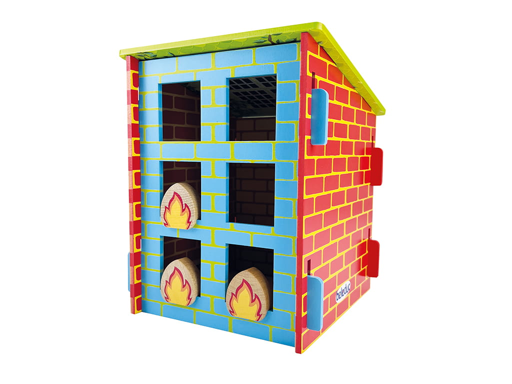 Η ιστορία είναι απλή και συναρπαστική. Το κτίριο παίρνει φωτιά, αλλά όλα τα ζώα και οι άνθρωποι έχουν ήδη διασωθεί. Οι πυροσβέστες ανεβαίνουν γρήγορα στο πυροσβεστικό όχημα, ετοιμάζονται να φτάσουν στο σημείο της φωτιάς και τα παιδιά μαθαίνουν να συνεργάζονται ώστε να σώσουν το κτίριο πριν καταστραφεί. Το σετ περιλαμβάνει ξύλινο πυροσβεστικό όχημα με έγχρωμο περιστρεφόμενο τροχό, ενισχύοντας τη φαντασία και την ενεργητική συμμετοχή.