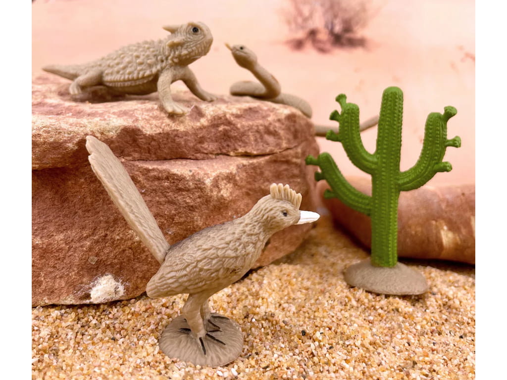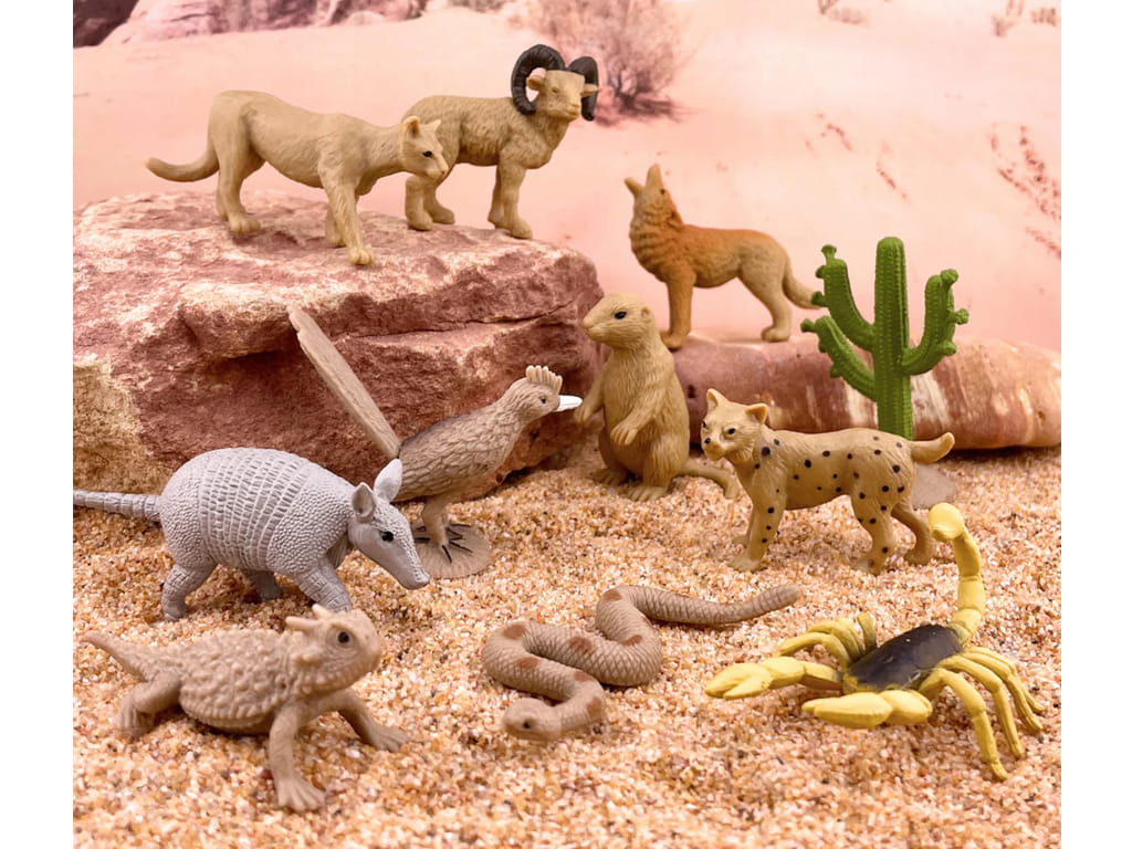 Το σετ «Φιγούρες ερήμου» προσφέρει μια εκπαιδευτική και διασκεδαστική εξερεύνηση της ζωής στην έρημο. Περιλαμβάνει φιγούρες ζώων και φυτών που ζουν σε ακραίες συνθήκες, όπως κερασφόρος σαύρα, κάκτος σαγουάρο σε ανάπτυξη, γεωκόκκυγας, σκορπιός, κροταλίας, κογιότ, μεγάλος κριός με κέρατα, ερυθρός λύγκας, αρμαδίλλος, ορεινή λεοπάρδαλη και σκίουρος της πεδιάδας.