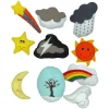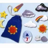 Φιγούρες καιρικά φαινόμενα. Όλες οι φιγούρες κολλάνε με ταινία βέλκρο πάνω στον πίνακα ή σε οποιονδήποτε πίνακα τσόχας! Το σετ έρχεται με μια τσάντα αποθήκευσης βαμβακερή. Μέγεθος: κάθε μοτίβο 3 x 9 εκατοστά περίπου. Ηλικία: 3 έτη +
