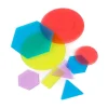 Γεωμετρικά σχήματα διάφανα περιλαμβάνει 40 γεωμετρικά σχήματα σε 2 μεγέθη και 4 χρώματα από πλαστικό ημιδιαφανές υλικό και 8 ημιδιαφανές κάρτες δραστηριοτήτων με επίπεδα δυσκολίας και φυλλάδιο οδηγιών. Ενθαρρύνει τα παιδιά να πειραματιστούν και να ανακαλύψουν τα σχήματα, τα μεγέθη, τα χρώματα και τα σχέδια. Μπορεί να χρησιμοποιηθεί σε φωτεινά τραπέζια και πάνελ.