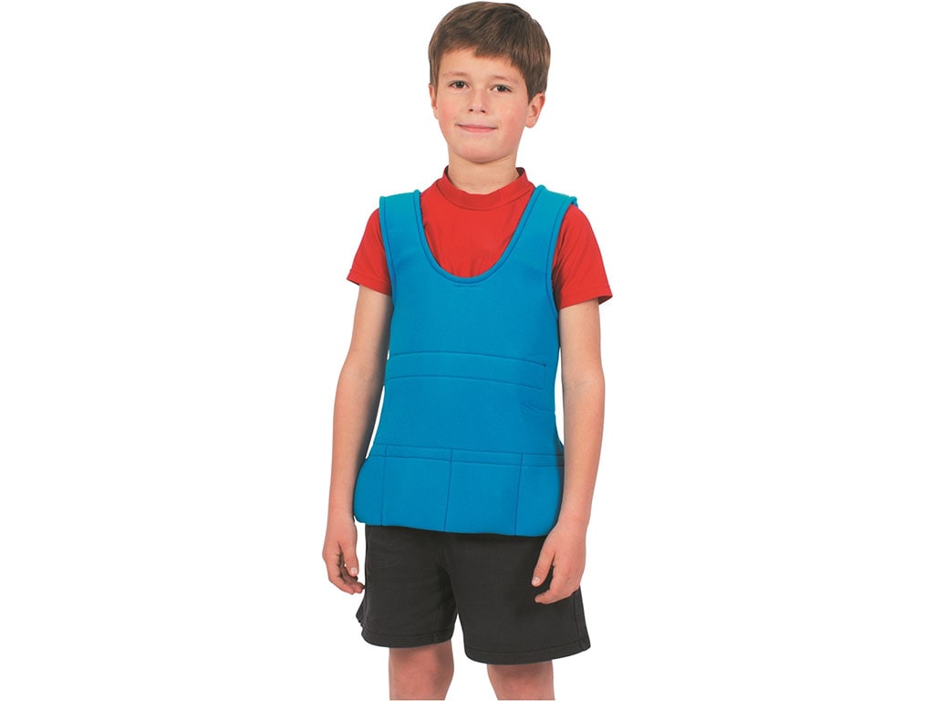 Βελούδινο απαλό και άνετο στη χρήση, αυτό το γιλέκο βοηθά στην επίγνωση της θέσης του σώματος χωρίς να ακινητοποιεί τον χρήστη. Τα βαρίδια εισάγονται κάτω από το κέντρο βάρους του χρήστη σε κρυφές τσέπες στο μπροστινό ή και πίσω μέρος του γιλέκου για να παρέχουν βαθιά πίεση και μια ηρεμιστική αίσθηση σταθερότητας του σώματος. Το γιλέκο γλιστράει εύκολα πάνω από το κεφάλι και κλείνει στα πλάγια με βέλκρο. Τα βάρη είναι κατασκευασμένα από ύφασμα νεοπρενίου το οποίο είναι γεμάτο με γκρίζα ορυκτή άμμο. Από πολύ απαλό ύφασμα πολυεστερικό. Μέγεθος Small: Μέση: 76 εκ. Ύψος: 38-51 εκ. (ρυθμιζόμενο). Βάρος: 1,4 κιλά.