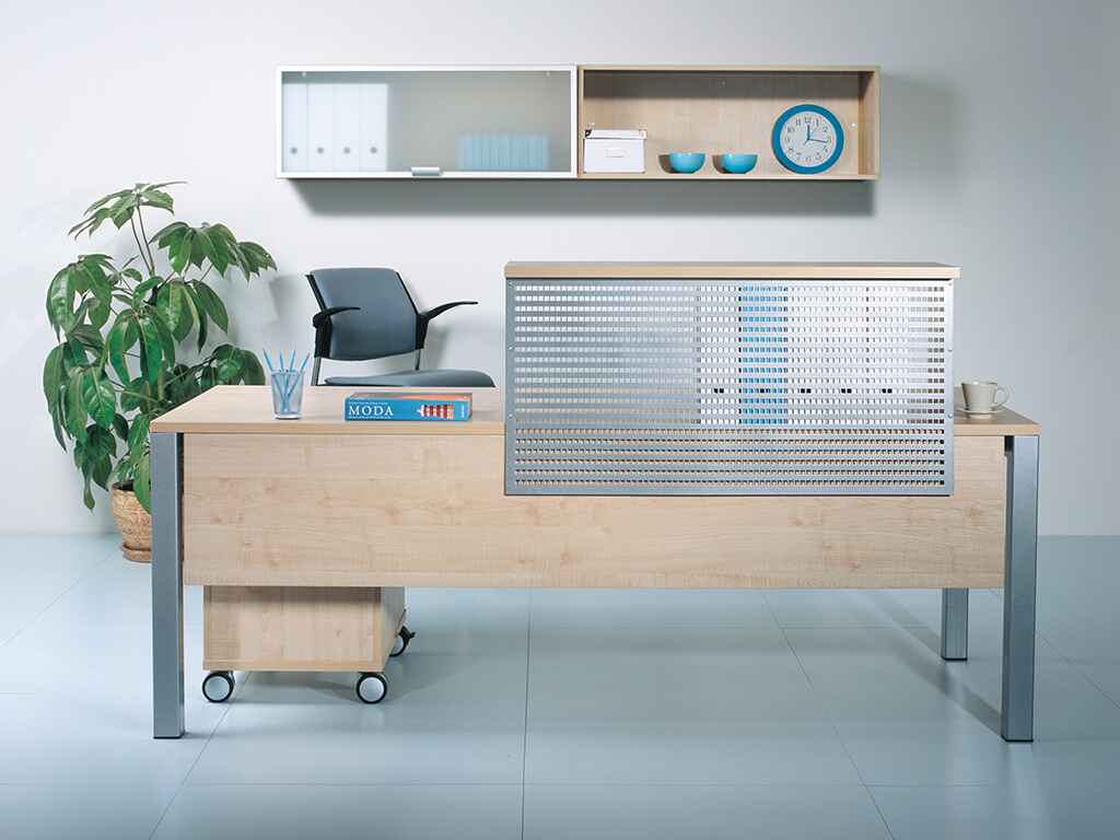 - Από μοριοσανίδα με επένδυση μελαμίνης, μεταλλικά πόδια τετράγωνης διατομής και μεταλλική διάτρητη πλάτη ρεσεψιόν.
